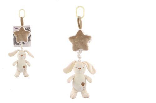 Naťahovací plyšový zajac s hviezdou hrá príjemnú melódiu, ktorá bábätko upokojí a pomáha mu pri zaspávaní. Hračku je možné zavesiť pomocou klipu na postieľku alebo kočík. Hrací strojček je zabudovaný vo vnútri hviezdičky, zajačik slúži ako naťahovací klip. Rozmer hračky: 36 cm Vhodné pre deti od 0 rokov