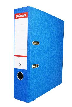 Mramorový papierový pákový zakladač s modrými doskami a chrbtom.