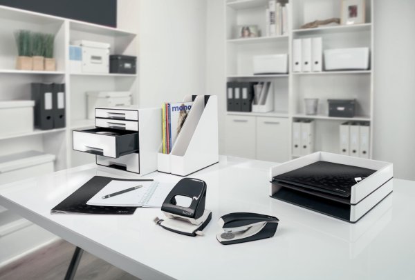 • Unikátna patentovaná mechanika Leitz 180 ° s predĺženou zárukou 5 rokov, poskytuje širšie otvorenie, možnosť zakladania väčšieho množstva papierov naraz a zároveň o 20% rýchlejšiu prácu so zoraďovačom a zakladanie na obe strany