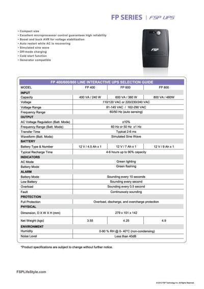 Fortron UPS FSP FP 800 je UPS záložný zdroj, ktorý udrží počítače, servery a inú IT techniku v chode pri výpadku elektrického prúdu. Prednosti tohto modelu sú predovšetkým jeho kompaktné rozmery, vysoká spoľahlivosť zaručená kvalitným mikroprocesorom, odolnosť voči automatickému vypnutiu, nabíjaniu aj v off-režime a funkcia studeného štartu.