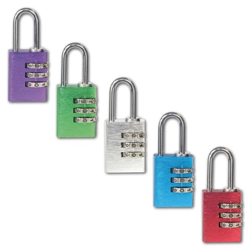 Hliníkový kódový visiaci zámok s eloxovaným povrchom. Ideálne pre zabezpečenie šatníkových skriniek a batožiny. Nastavenie vlastnej kombinácie, ktorú môžete kedykoľvek zmeniť. 1.000 kombinácií zámku. mix farieb: strieborná, červená, modrá, fialová, zelená Hmotnosť netto: 0,06 kg