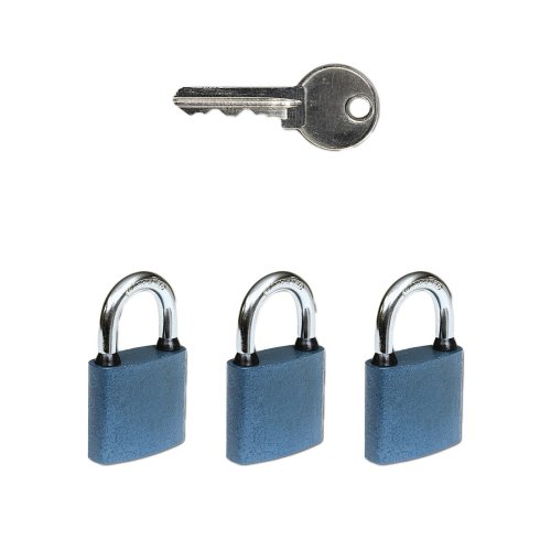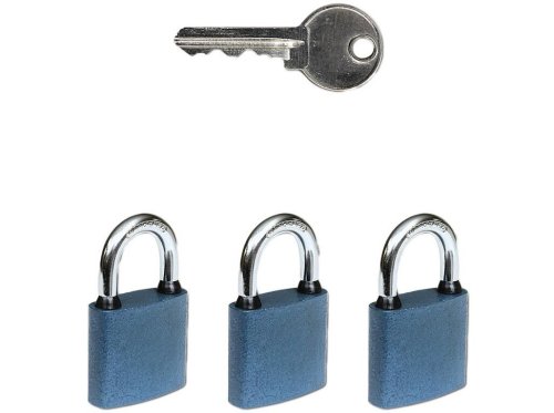 Set 3 ks visiacich zámkov na spoločný uzáver – „SU“. Náhodný kód kľúča. Klasický liatinový zámok. Strmeň HARDENED, istený v dvoch bodoch. Gumové krúžky chrániace liatinové teleso proti prieniku vody. Zamykanie bez kľúča - zatlačením strmeňa. Vložka zámku s 5 odpruženými stavítkami.