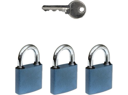 Set 3 ks visiacich zámkov na spoločný uzáver – „SU“. Náhodný kód kľúča. Klasický liatinový zámok. Strmeň HARDENED, istený v dvoch bodoch. Gumové krúžky chrániace liatinové teleso proti prieniku vody. Zamykanie bez kľúča - zatlačením strmeňa. Vložka zámku s 5 odpruženými stavítkami.