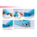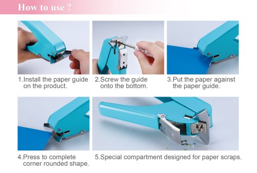Ručné kliešte na zaobľovanie rohov s kapacitou až 10 listov a polomerom zaoblenia 5 mm . Kliešte sú vybavené zásobníkom na odstrihnuté rožky , vďaka ktorému nemusíte odstrihnuté rožky zbierať po stole alebo na podlahe.