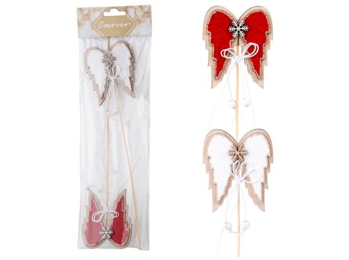 Dekoračný drevený zápich s motívom anjelských krídiel o rozmere 65×80 mm, upevnený na špajli pre ľahké zapichnutie. Balenie obsahuje 2 kusy, farebné prevedenie je dodávané v mixe prírodnej, červenej a bielej farby s jemným glitrom.