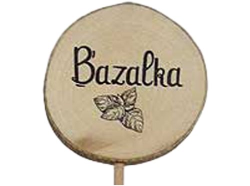 Drevený zápich s nápisom „bazalka“ na označenie byliniek v kvetináči alebo na záhone.