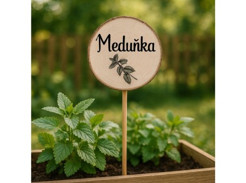 Drevený zápich s nápisom „medovka“ na označenie byliniek v kvetináči alebo na záhone.