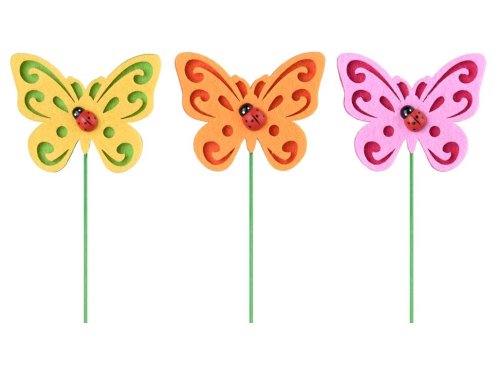 Tento filcový zápich s rozmermi 80×65 mm je upevnený na pevnej špajli, vďaka ktorej sa ľahko umiestni do kvetináčov, hrantíkov, dekoratívnych košíkov či vencov. Motív motýľa pôsobí sviežo, hravo a dodáva aranžmánom živý, jarný charakter. Farebný mix umožňuje kombinovať viacero variantov a vytvárať tak pestré a originálne dekorácie. Zápich je ľahký, odolný a vhodný na opakované použitie, čo z neho robí ideálny doplnok pre domácu výzdobu aj sezónne kreatívne tvorenie. Tovar je dodávaný v mixe. Doručovaný tovar je vyberaný náhodne a nie je možné vybrať konkrétne prevedenie.