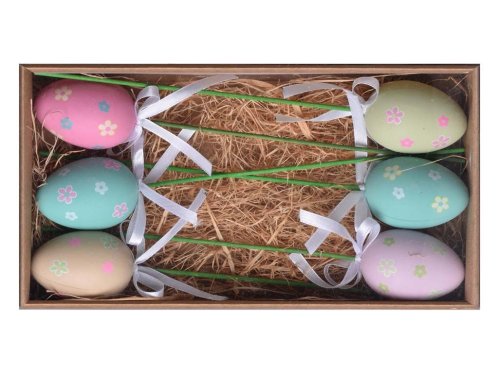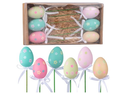 Sada veľkonočných zápichov obsahuje 6 plastových kraslíc o veľkosti 60 mm, zdobených jemným motívom kvietkov. Každá kraslica je upevnená na drevenej špajli, vďaka čomu sú ideálne na zdobenie kvetináčov, jarných aranžmánov, osení alebo vencov. Balené v praktickej krabičke, vhodné aj ako darček. Mix farieb dodá výzdobe veselý jarný vzhľad. Tovar je dodávaný v mixe. Doručovaný tovar je vyberaný náhodne a nie je možné vybrať konkrétne prevedenie.
