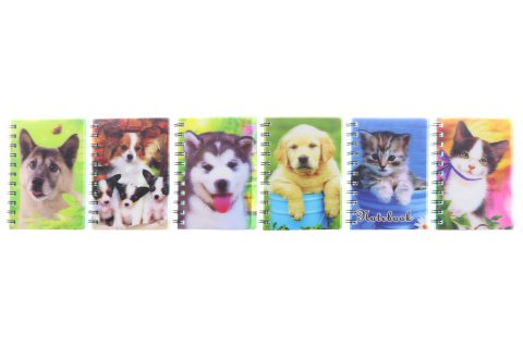 Krúžkový blok s motívom psíkov a mačičiek. Rozmery cca 10,5 x 14,5 cm. Vnútri riadkované listy s bielym okrajom. Výrobok nie je hračka.