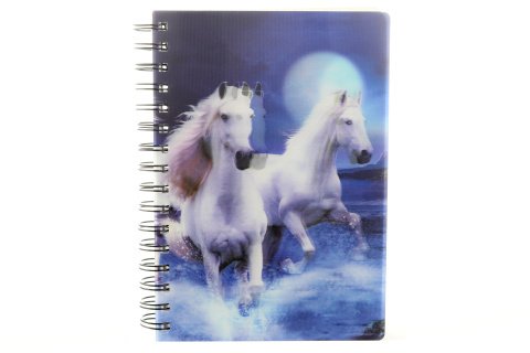 Zápisník s 3D efektom s motívom Koní. V zápisníku je celkom 100 listov, z ktorých je 50 linkovaných a 50 nelinkovaných. Formát A5. Výrobok nie je hračka.