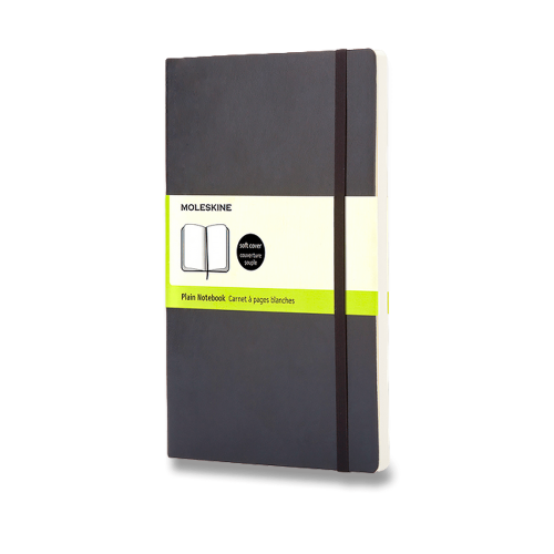 Zápisník s mäkkou, v chrbte šitou väzbou v kartónových doskách, obopnutý pružnou páskou proti samovoľnému otváraniu. Zápisník je vybavený zoraďovačom poznámok, ktorý je vyrobený z tkaniny a kartónu, textilnou záložkou a letákom s históriou MOLESKINE. Gramáž papiera 70 g/m2, neobsahuje kyseliny. Rozmer : 13 x 21 cm, 96 listov, čistý