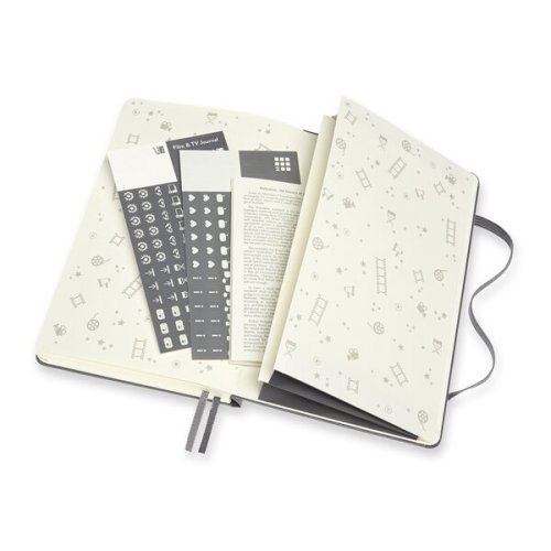 Zápisník s pevnou, v chrbte šitou väzbou v kartónových doskách s reliéfnym zdobením. Obopína ho pružná páska proti samovoľnému otváraniu. Zápisník je vybavený 2 textilnými, záložkami, dvojitým vnútorným vreckom, farebnými samolepkami a letákom s históriou MOLESKINE. V úvodnej časti nájdete zoznam filmových festivalov, glosár a míľniky z histórie kinematografie., Zápisník je rozdelený do 3 tematických sekcií so špecifickým rozvrhnutím strán (zoznam sledovaných alebo obľúbených filmov a seriálov, kľúčové informácie, hodnotenia, dojmy a recenzie) a, obsahuje aj prázdne strany., Gramáž papiera 70 g/ , ROZMER: 13 X 21 CM, 200 LISTŮ, Zápisník je v anglickom jazyku., O ZNAČKE MOLESKINE:, Príbeh značky MOLESKINE sa začal písať už v 19. storočí vo Francúzsku, kedy vznikol produkt s veľkou tradíciou. Zápisníky MOLESKINE si obľúbili významní umelci a myslitelia ako Vincent van, Gogh, Pablo Picasso či Ernest Hemingway. Dnes je značka Moleskine synonymom pre kultúru, cestovanie, kreativitu a osobnú identitu, a to ako v reálnom svete, tak aj vo svete digitálnom., MOLESKINE je kreatívnym a nápaditým partnerom pre dnešnú dobu.