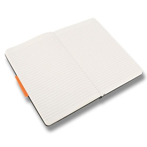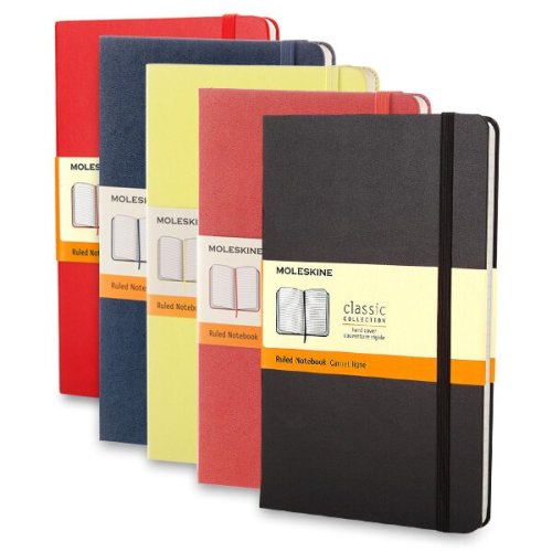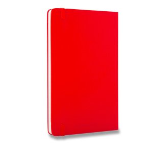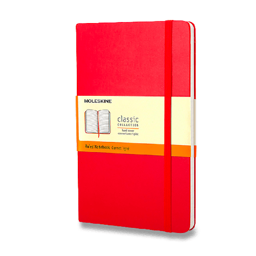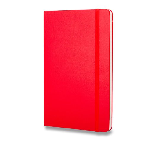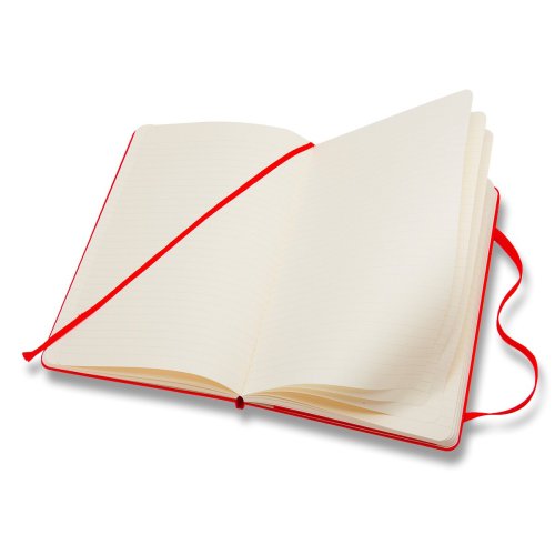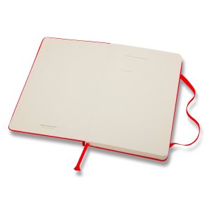 Veľký červený linajkový zápisník. Zápisník má pevnú, v chrbte šitú väzbu v kartónových doskách. Obopína ho pružná páska proti samovoľnému otváraniu. Každý zápisník je ďalej vybavený zoraďovačom poznámok, ktorý je vyrobený z tkaniny a kartónu, textilnou záložkou a letákom s históriou Moleskine. Papier neobsahuje kyseliny.