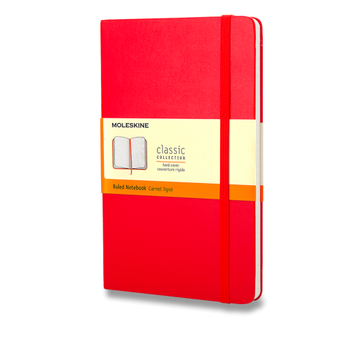 Červený linajkový zápisník vreckovej veľkosti. Zápisník má pevnú, v chrbte šitú väzbu v kartónových doskách. Obopína ho pružná páska proti samovoľnému otváraniu. Každý zápisník je ďalej vybavený zakladačom poznámok, ktorý je vyrobený z tkaniny a kartónu, textilnou záložkou a letákom s históriou Moleskine. Papier neobsahuje kyseliny.