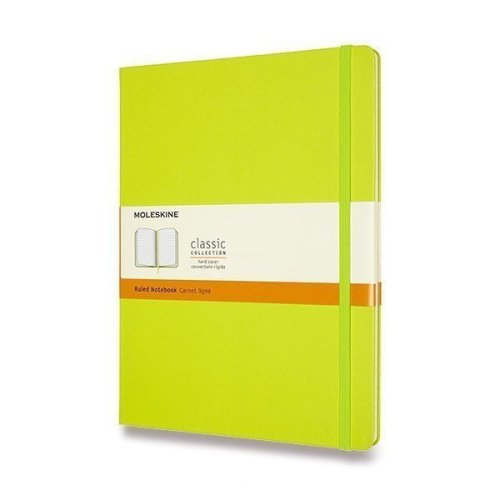 Linkovaný XL zápisník v tvrdej väzbe. Obopína ho pružná páska proti samovoľnému otváraniu. Každý zápisník je vybavený zoraďovačom poznámok, ktorý je vyrobený z tkaniny a kartónu, textilnou záložkou a letákom s históriou Moleskine. Papier s gramážou 70 g/m2 neobsahuje kyseliny.