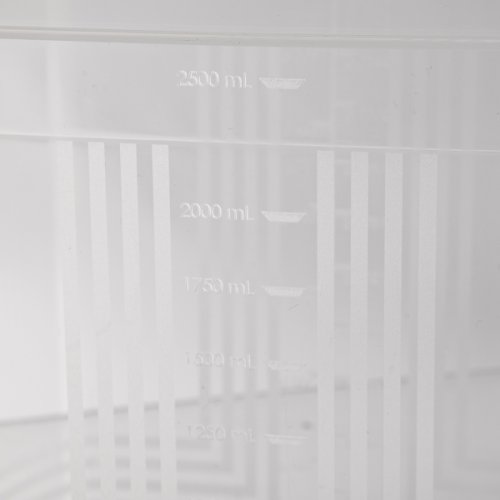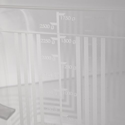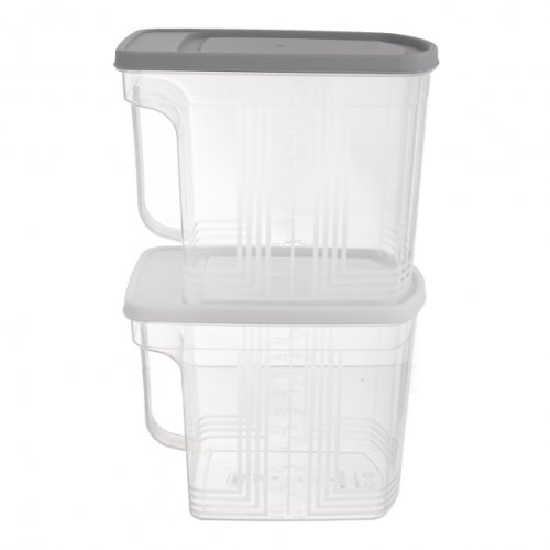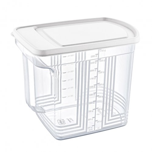 Zásobnice na potraviny s viečkom as držadlom. Pohodlne a prehľadne uloží múku, cukor, soľ, krupicu... Vďaka uchu je veľmi pohodlná na manipuláciu. Viečko zabráni rozsypaniu, zvlhnutiu, preberaniu vôní a chutí z ostatných potravín uložených v skrinke. Vďaka transparentnosti máte na prvý pohľad prehľad o obsahu zásobnice. Odmerka v ml (do 2.5 l po 250 ml), pre cukor a múku tiež odmerka vg (cukor do 2,5 kg po 250 g, múka do 1.75 kg po 250 g). Vďaka tvarovanému viečku dobre stohovateľné. Materiál plast, mix farieb. Objem (do plna) 2.75 litra, rozmery 13 x 21 x 16.5 cm. Vhodná do umývačky riadu, bez viečka aj do MVT. EAN 8694064016231
