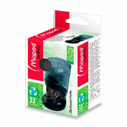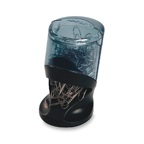 Zásobník na kancelárske sponky s magnetickým držiakom. Nekĺzajúci podstavec, priehľadná nádobka. Súčasťou balenia je 100 ks poniklovaných sponiek,,