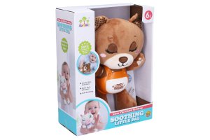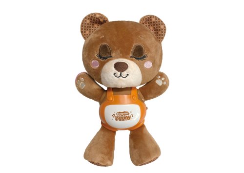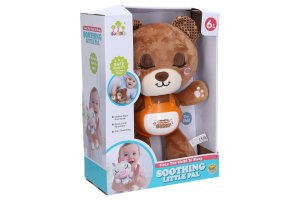 Zaspávačik medveď. Veľkosť 29 cm. batérie 3xAAA nie sú súčasťou. Prepínač on/off na boku zvieratka. Stlačením bruška sa spúšťa zvukové efekty- 1. stlačenie uspávanka, 2. stlačenie upokojujúca hudba, 3. stlačenie chrápania, 4. stlačenie iba svetlo, 5. stlačenie vypnutia, 6. stlačenie - premenlivý režim.