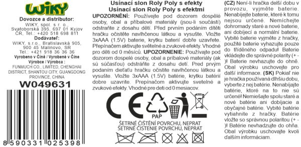 Zaspávací slon Roly Poly s efektmi. Veľkosť 16 cm. Batérie 3xAAA nie sú súčasťou. Tlačidlo on/off. Tlačidlo na zvukové efekty. Svetelné a zvukové efekty.