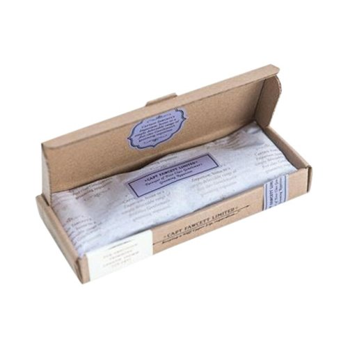 Zastrihávacie nožnice na fúzy sú zabalené v puzdre z prírodne farbenej kože a zaistené remienkom a mosadznou sponou.