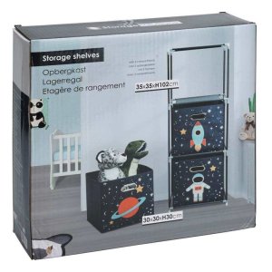 zásuvková skrinka s 3 priehradkami, kovový rám s netkanou textíliou 80gsm modrej farby s policami, rozmery: 35x35xh102cm, hrúbka trubiek: 95mm, modrá farba rámu, s 3 netkanými úložnými boxmi v dizajne detského priestoru a kovovou