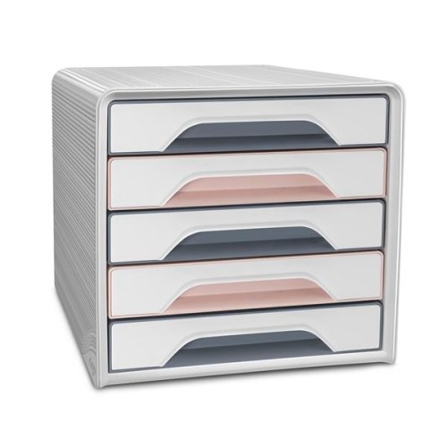 Zásuvkový box Mineral Smoove je vytvarovaný z jedného kusu, má veľmi robustný korpus s textúrovaným povrchom a päť zásuviek s potlačou bukového vzoru, ktorý pôsobí jemne a dekoratívne