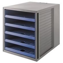 Zásuvkový box KARMA s 5 zásuvkami na papier formátu DIN A4 a väčší ocenený ekologickým certifikátom "BLUE ANGEL" Zásuvky majú zarážku proti vytiahnutiu a otvor s rukoväťou pre ľahké vybratie.