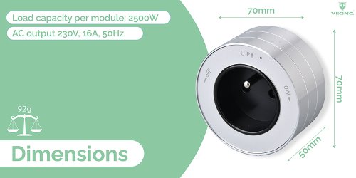 Technické špecifikácie: Model: Zásuvkový modul Viking A30 Prípojkový konektor vstup: 230V, 16A, 50Hz Záťažový výkon na jeden modul: 2500W AC výstup: 230V, 16A, 50Hz Rozmery: 7 cm x 7 cm x 5 cm Hmotnosť: 92g