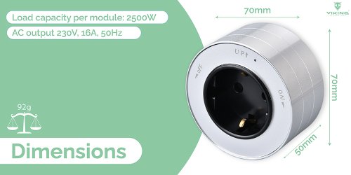 Technické špecifikácie: Model: Zásuvkový modul Viking A40 Prípojkový konektor vstup: 230V, 16A, 50Hz Záťažový výkon na jeden modul: 2500W AC výstup: 230V, 16A, 50Hz Rozmery: 7 cm x 7 cm x 5 cm Hmotnosť: 92g