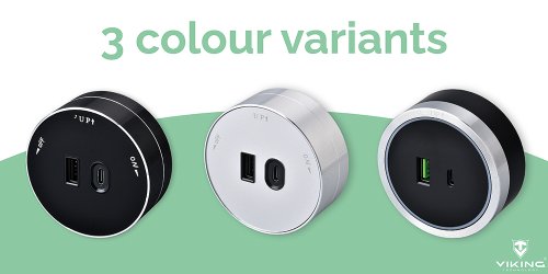 Zásuvkový modul Viking A60 je vybavený jedným USB-A výstupom (5V/2,4A) a jedným USB-C výstupom (5V/3,6A, PD) a je k dispozícii v troch farebných variantoch.