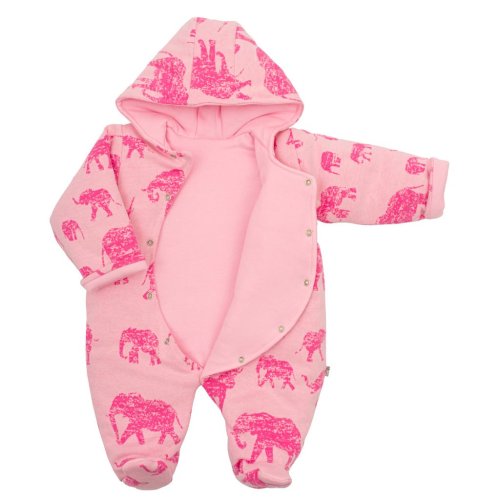 Dojčenská kombinéza s kapucňou Baby Service Slony pre bábätká. Zateplená kombinéza je zdobená potlačou slonov, je vyrobená z príjemnučkého materiálu s bavlnenou podšívkou, antialergickou výplňou a praktickou kapucňou. Bočné zapínanie po celej dĺžke a medzi nožičkami na cvočky uľahčuje obliekanie a prebaľovanie. Kombinézka je celopodšitá bavlnenou podšívkou. Zloženie: 65% bavlna, 35% polyester, podšívka: 100% bavlna, výplň: 100% antialergické vlákno. Vyrobené v SR.