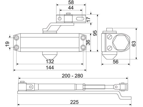 Dverný zatvárač pre interiérové dvere. Pre dvere do šírky 850 mm a váhy 45 kg podľa EN 1154. Nastaviteľná rýchlosť zatvárania a doklapu, ramienko je súčasťou balenia.
