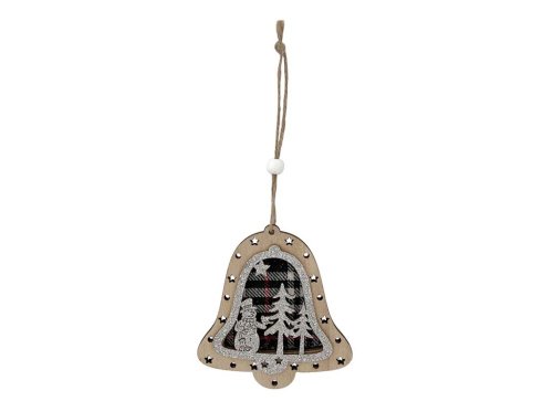 Záves drevo 100x95mm zvonček so snehuliakom a stomčekmi, prírodné s glitrom, strieborná
