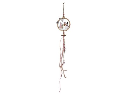 Záves drevo 120x120mm gulička so snehuliakom, prírodná, biela, ružová