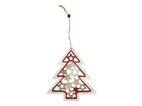 Záves drevo 155X170mm stromček s hviezdičkami, prírodný s glitrom, biela, červená