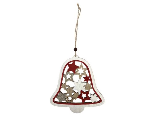 Záves drevo 160x170mm zvonček s hviezdičkami, prírodný s glitrom, červená, biela