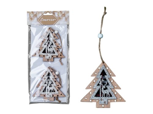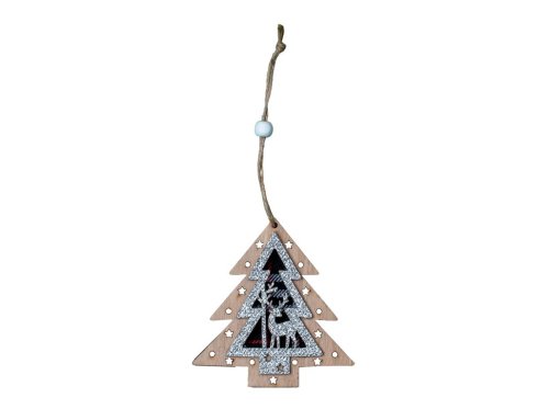 Záves drevo 2 ks 95x100mm stromček, prírodný s glitrom, strieborná