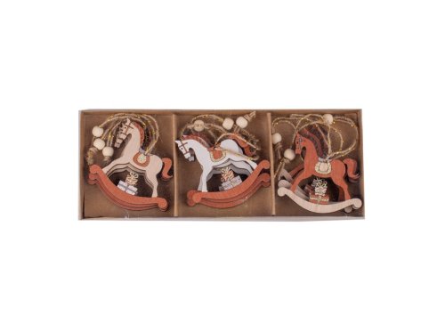 Závesné dekorácie z dreva s motívom koňa s darčekmi o rozmere 80×70 mm. Sada obsahuje 9 kusov, ktoré sú dodávané vo farebnom mixe hnedej, krémovej a bielej farby s jemným glitrom. Jednotlivé dekorácie sa môžu mierne líšiť vzhľadom.