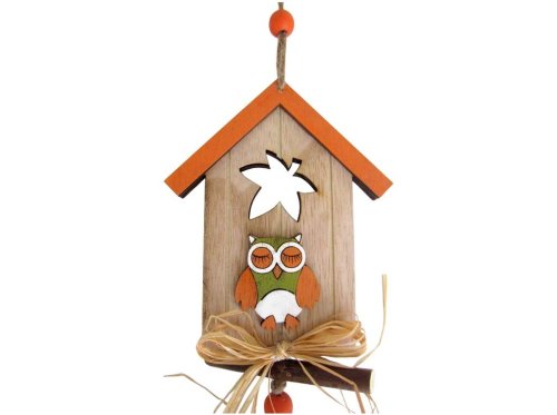 Záves drevo 95x130mm domček so sovou, prírodná, oranžová