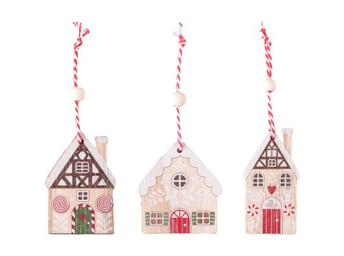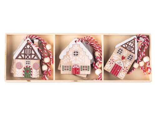 Záves drevo 9ks 55x75mm domčeky v krabičke, prírodná, farebná