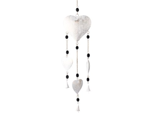 Ľahká závesná kovová dekorácia s motívom srdiečok v bielej farbe je ideálna na zavesenie do interiéru – na kľučku, háčik, vešiak alebo ako doplnok darčekového balenia. Jemný rustikálny vzhľad a decentná farba vytvárajú útulnú a láskyplnú atmosféru.