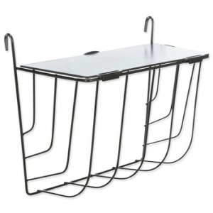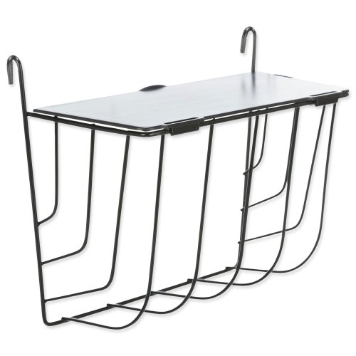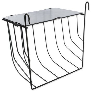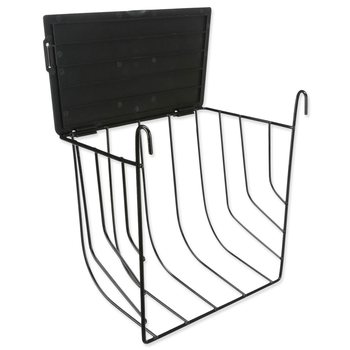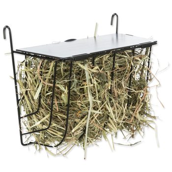 Závesné kovové jasličky na seno s vekom v čiernej farbe.