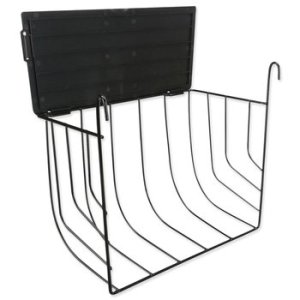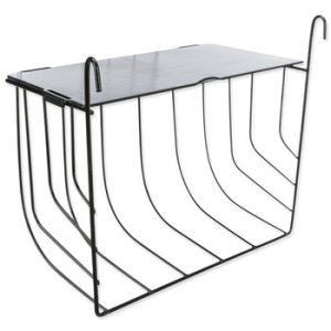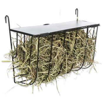 Závesné kovové jasličky na seno s vekom v čiernej farbe.