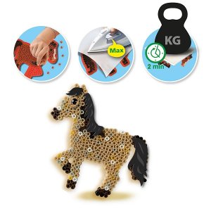 Preskúmajte kreativitu so sadou korálikov Kone – nádhernou zažehľovacou sadou korálikov pre deti, ktoré milujú kone a umelecké projekty. Sada obsahuje 1200 ks zažehľovacích korálikov, podložku v tvare koňa, sadu samolepiek a zažehľovací papier. Táto detská remeselná sada pomáha rozvíjať jemnú motoriku, trpezlivosť a kreativitu, keď deti aranžujú korálky a vytvárajú realistické vzory koní. Korálky neobsahujú PVC. Balené v krabičke. Rozmery balenia: 20 x 15 x 4 cm. Nevhodné pre deti do 3 rokov. Vek: 5+