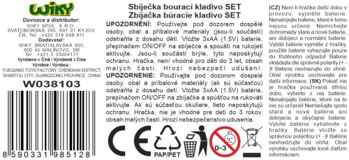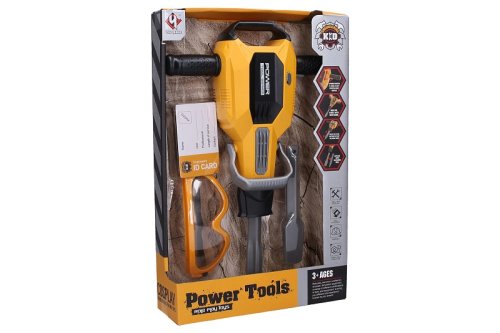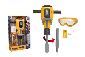 Zbíjačka búracie kladivo set. Rozmery 26,5x8,5x41,6 cm. Súčasťou zbíjačka, 2 vrtáky, ochranné okuliare, vizitka. Svetelné efekty. 3xAA batérie nie sú súčasťou. Prepínač ON/OFF na zbíjačke, spúšť na rukoväti.