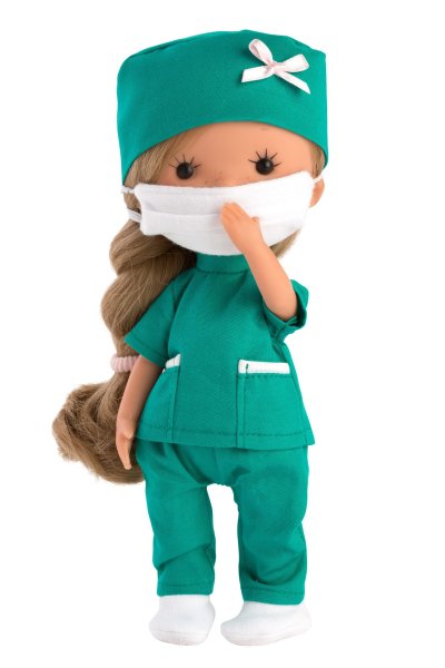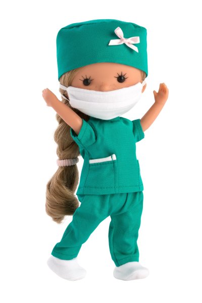 Bábika bez zvuku s vinylovým telom a vlásky po celej hlave. Ruky a nohy sú k telu prichytené kĺbom. Bábika je polohovacia a môže aj sedieť. Veľkosť bábiky 26 cm. Ručne vyrobené v Španielsku, balené v darčekovej krabici v tvare kornútku. Odporúčaný vek od 3 rokov.