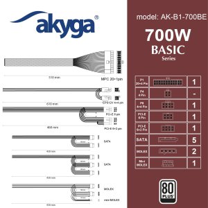 Akyga® AK-B1-700BE je napájací zdroj zo série Basic s výkonom 700 W. Zariadenie je jedným zo základných napájacích zdrojov ATX Akyga používaných na napájanie stolných počítačov.