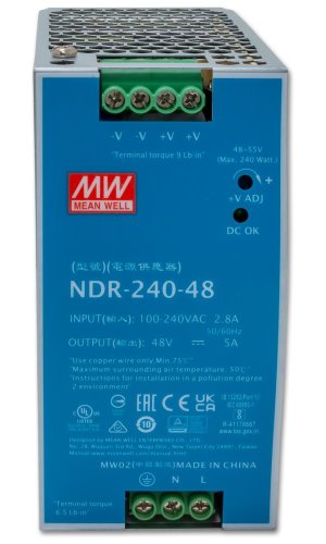 Napájací zdroj pre inštaláciu na DIN lištu. Výstupné napätie 48 V DC, zaťažiteľnosť 240 W. Prevádzková teplota -10 až 70 °C.