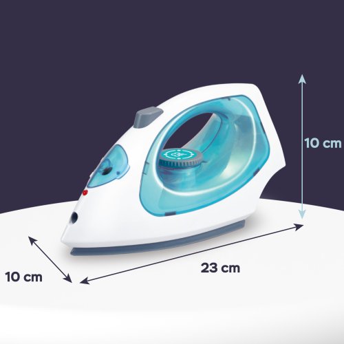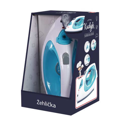 Plastová žehlička bielo-tyrkysovej farby s ktorou budeš mať šatôčky pre svoje bábiky vždy perfektne vyžehlené! Doplň vodu do žehličky (pomocou fľaštičky v balení), pri stlačení tlačidla žehlička vydáva zvuk, svieti a vypúšťa paru. Funguje na 3 ks batérií typu AA, ktoré nie sú súčasťou balenia.